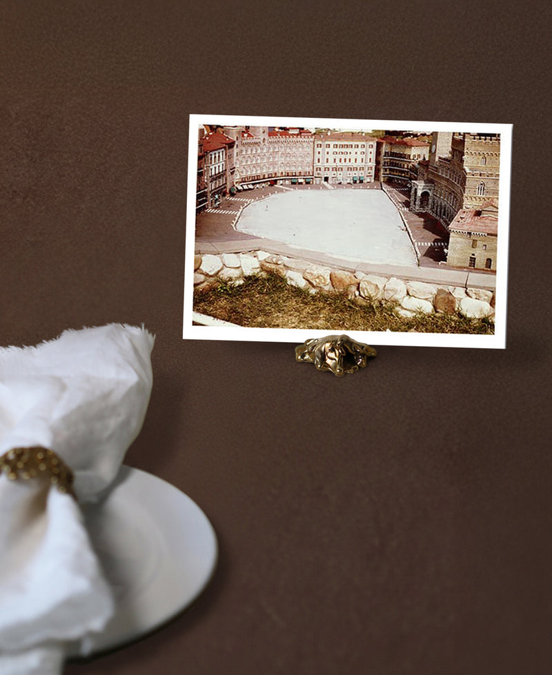 A palm-size sculpture that holds a place card, note, or photo. Works as a name-card stand at dinner or a minimal desk accent. The molten surface catches light with a soft glow.